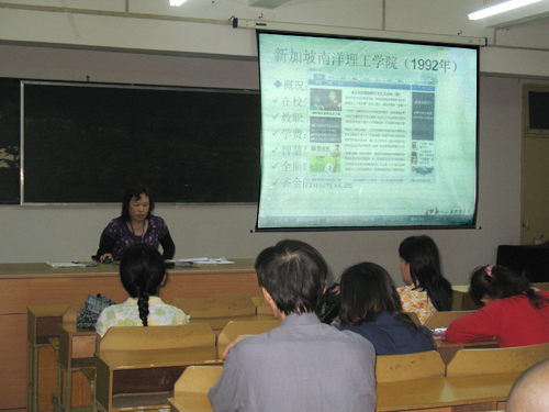 艺术设计系副主任廖桂英首先图文并茂地介绍了新加坡南洋理工学院、新加坡共和理工学院、新加坡理工学院的发展历史和办学经验,从学校的组织文化、创新理念到高素质师资队伍的建设以及先进的教学设施,并重点介绍了每个学校的办学特色。廖桂英副主任指出,新加坡南洋理工学院办学采用了独特的教学模式,即“教学工厂”模式和“项目教学”模式,这是一种企业实习、企业项目与学校教学有机结合的办学理念,有利于使学生将所学到的知识和技能应用于多元化、多层次的工作环境里。