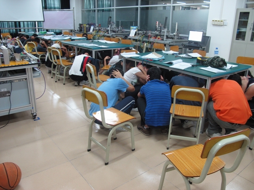 16点42分,学院紧急拉响防空警报,“紧急避震”演练开始。演练预警发出后,指挥协调组人员立即进行现场指挥,全院上课的师生首先按照避震正确姿势进行避震。两分钟后,紧急疏散警报发出,进行“紧急疏散”演练,师生们按照疏散顺序,在疏导员的指挥、组织下,有序疏散。为防止学生相互推挤、掉队和踩踏,疏导员让同学们按照“前后排分开,先中间后两边,先低层后高层”的撤离程序迅速有序地撤离到操场中央。同时,走廊、楼梯转角处均安排有疏导员接应,防止出现跳楼和踩踏事故。不到5分钟,所有师生全部撤离到学院操场,静静地等待警报的解除。各班班干在清点人数并向学生专干汇报后,带领同学们回到教室继续上课。