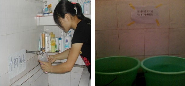 2009级电气自动化技术(1)班的节约用水宣传活动更是搞得有声有色。他们以“节水全民行动,共建生态家园”为活动主题召开班会,班会首先给同学观看今年一些地区受灾旱的短片,然后让同学们谈谈在日常生活中如何节约用水的方法及从影片中得到的感受,最后全班同学用自己的签名,组成“节约用水”四个大字。主题班会开得十分活跃,有新异,寓教于乐。之后,还在五月份开展“节水宿舍评比”; 在宿舍楼前的宣传栏上介绍有关节约用水的小知识;在宿舍内张贴节水标语(标语由各个宿舍自行设计、制作);联合宿舍管理员,对全体宿舍的用水设备、管道器具进行仔细清查、维修,杜绝漏水现象;一水多用,建议每个宿舍将平时放出来的冷水(如洗脸水等)集中在水桶里,冲洗地板或卫生间时即可随时使用。