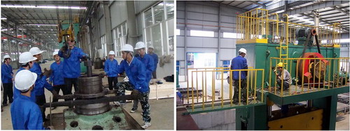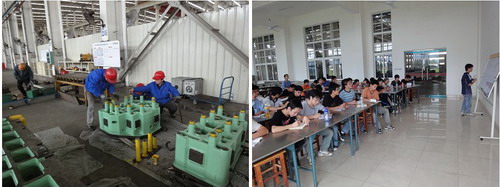 左图:在柳州福臻车体实业有限公司实习的学生在细心操作;右图:学生在柳州福臻车体实业有限公司进行强化训练