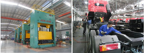 左图:学生安装调试好的大型油压机准备投入使用;右图:一台台经过学生准确装配后的霸龙汽车纷纷下线