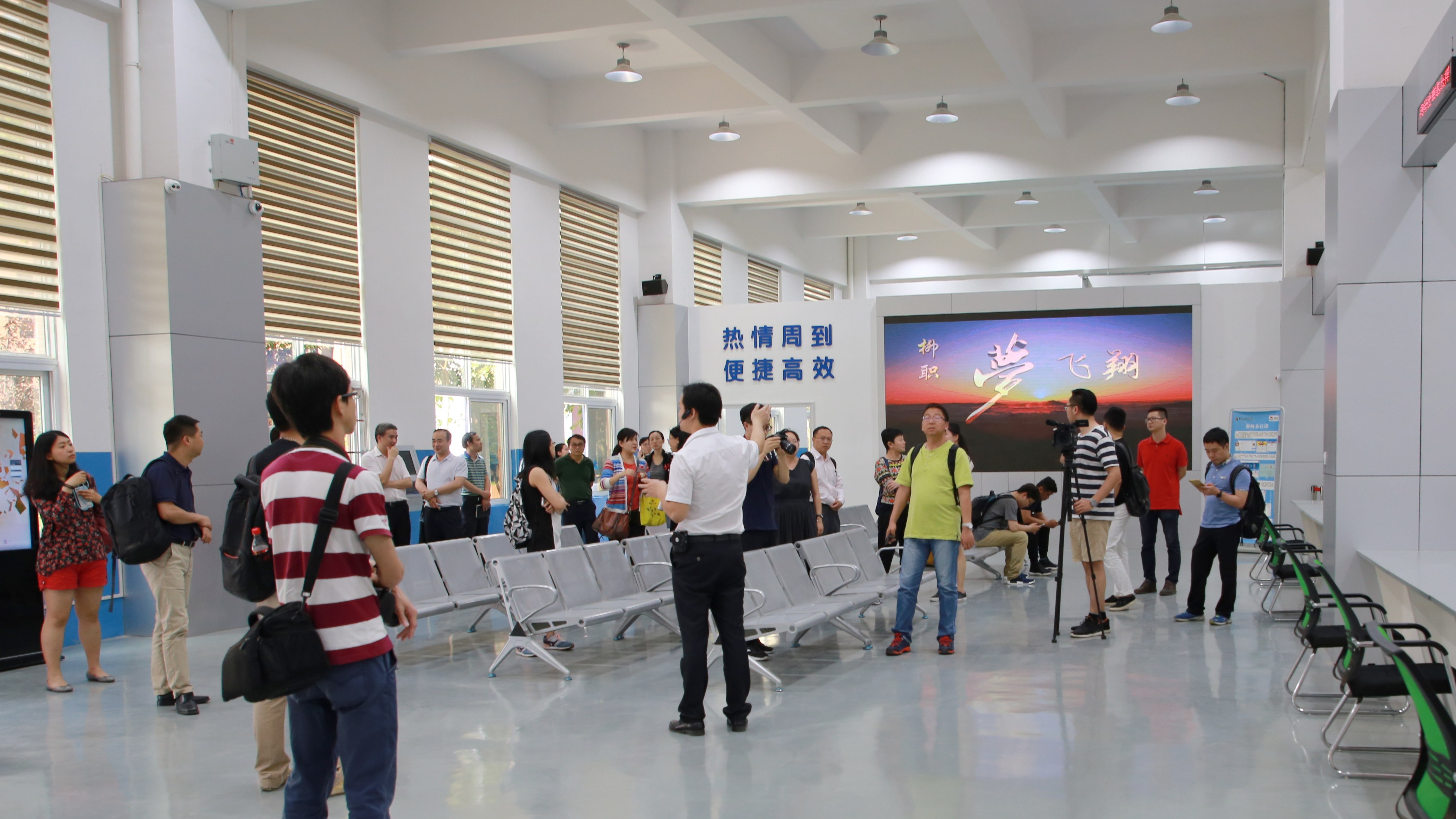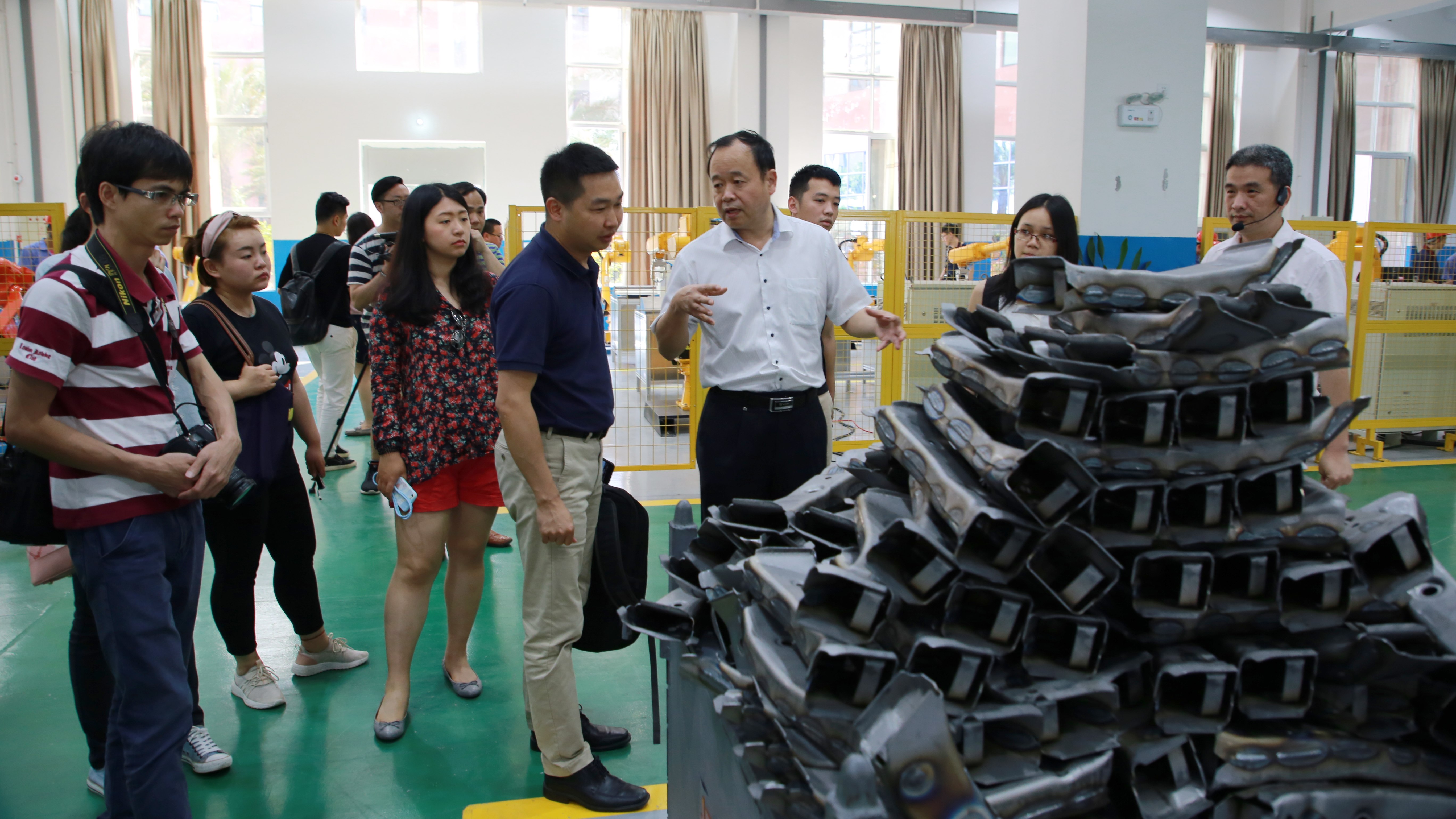 在自治区教育厅新闻办副主任宋潇潇、柳州市教育局副局长潘旭阳、职成科副科长佘莹;我校领导石令明、张翔、阳旭、林若森等人员的陪同下,采访团参观了我校官塘校区三个中心:综合服务中心、协同创新研究院的工业机器人实训中心、柳工-柳职院全球客户体验中心。