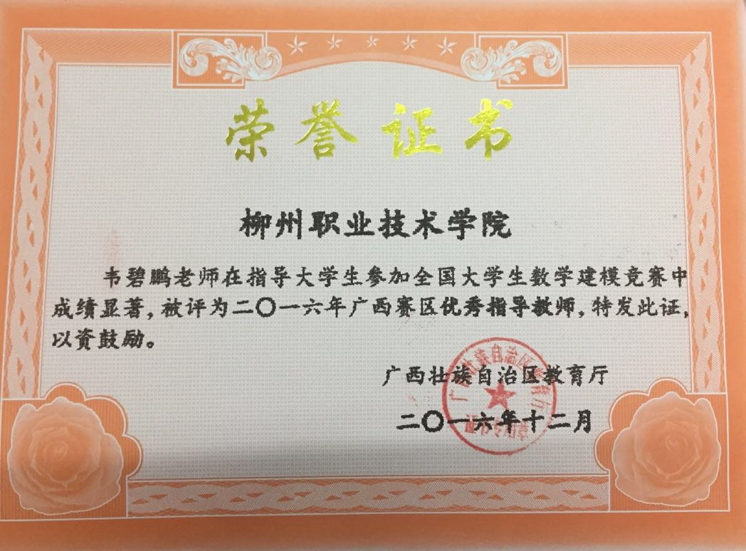 •       韦老师2012年入职以来,多次指导学生参加全国大学生数学建模竞赛,多次荣获国家级、省级奖项,其本人也多次获得国家级、省级“优秀指导教师”荣誉称号,在我区高校数学建模圈已小有名气。