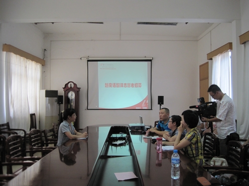 2010年7月8日下午,柳州市团委莅临我院进行“中越青年大联欢”越南语翻译志愿者招募,活动在行政楼8楼会议室举行。面试评委组由团市委宣传部副部长胡泉、我院团委副书记杨琳和经济管理系越南语教师赵雪雷组成,经济管理系2008级应用越南语班全体学生到场参加了面试。