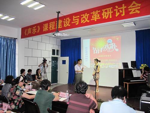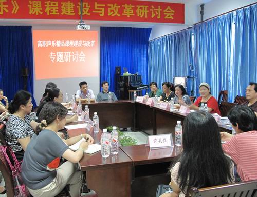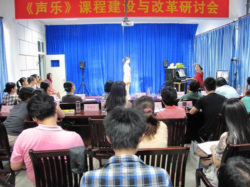 为了更好地服务社会,培养社会所需人才,加快《声乐》国家精品课程改革与建设的步伐,2010年7月8日,在学院领导的大力支持下,我院音乐系在荣军校区音乐楼课程研讨室成功举办了“声乐课程教学改革与建设”研讨会。本次会议邀请的专家有教育部高等学校高职高专表演艺术类专业教学指导委员会主任王远教授和来继文秘书长、中国音乐教育学学会常务理事及广西壮族自治区音乐教育专家陈玉丹教授、我院副院长张翔教授和教务与实训管理处处长鞠红霞教授。同时还邀请了广西艺术学院、广西教育学院、广西幼儿师范高等专科学校、贺州学院、钦州学院、桂林师范高等专科学校、柳州师范高等专科学校、柳州城市职业学院等八所兄弟院校的领导和专业骨干教师参加?;嵋橛梢衾窒蒂芾蛑魅沃鞒?。