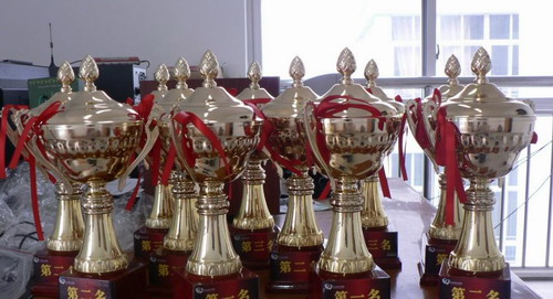 学生在体育竞赛中赢得金灿灿的奖杯