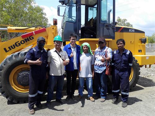 柳职院优秀毕业生欧阳硕(左三)成为柳工海外专员班出色的一员,图为欧阳硕在印尼帮客户修理变速器后合影。