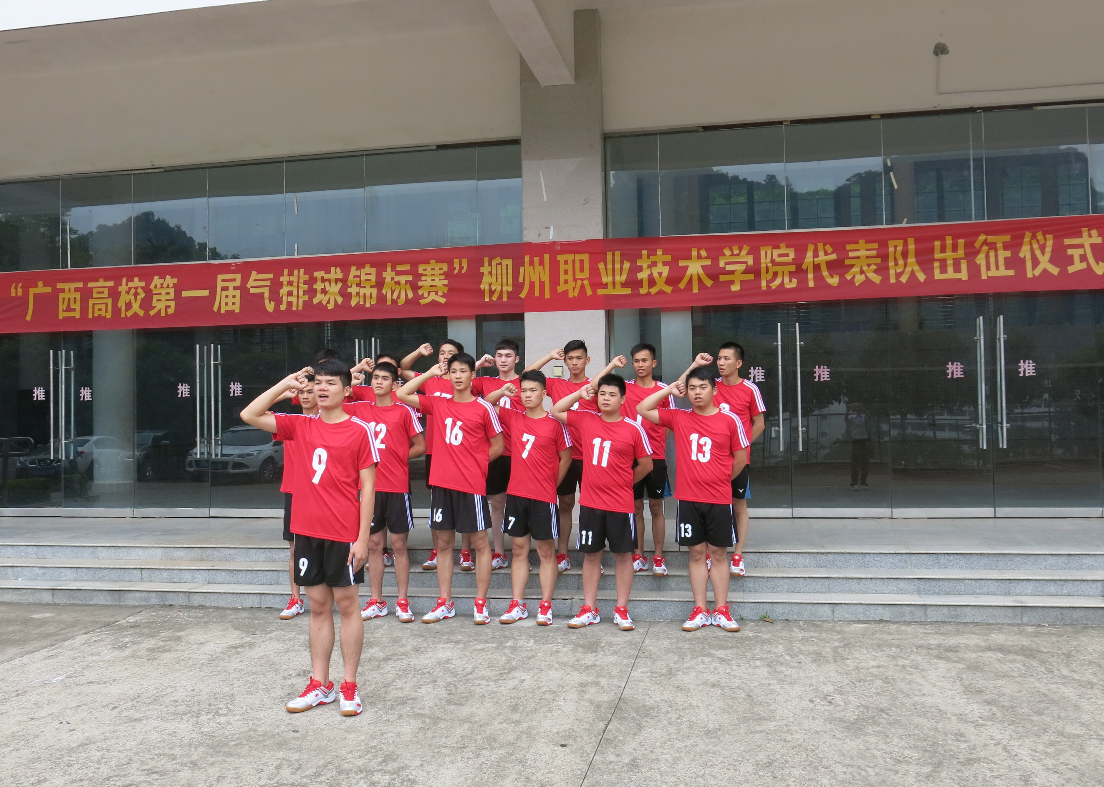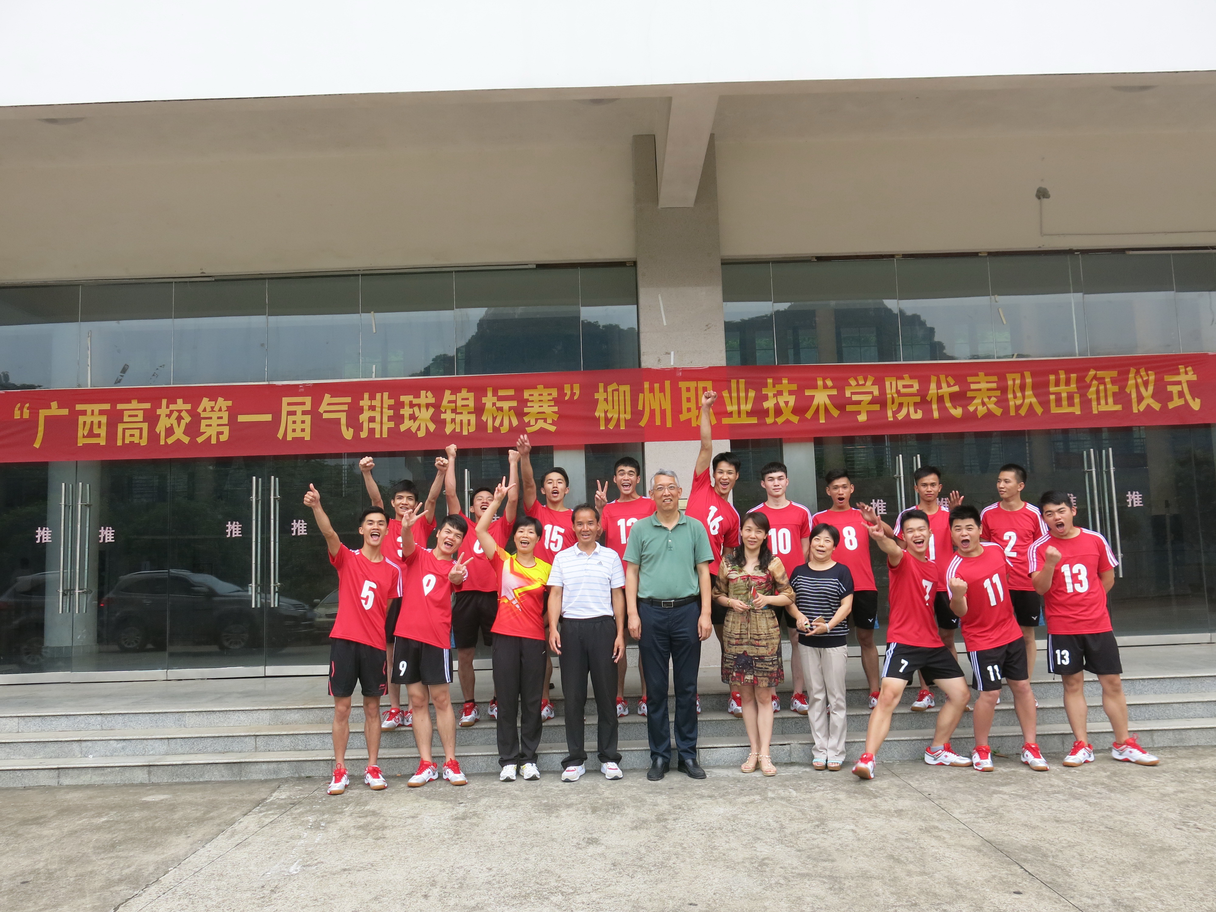 新闻网消息(文、图/公共基础部 黄志卫)5月18日下午,参加广西高校第一届气排球锦标赛的我校运动代表队在体育馆前举行出征仪式,学校副校长杨毅,公共基础部、思政部领导以及全体教练员、运动员出席仪式。