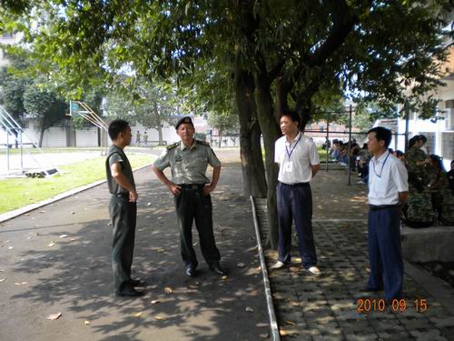 承训部队领导江主任(左二)及学院相关部门领导向教官了解军训进展情况