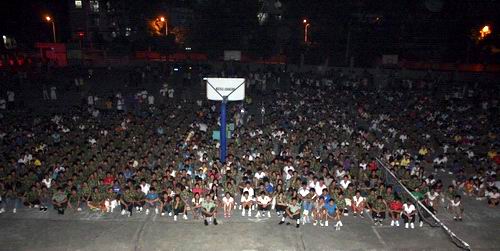 晚上19时,夕阳的余辉还未褪尽,2010级新生们在教官的指挥下,按班级列队站好,等待电影的播放。影片《太行山上》讲述的是八路军总司令朱德同志率领115、120和129三个主力师东渡黄河,挺进抗日前线开辟并建立太行山根据地的故事。影片也吸引了很多大二、大三年级的学生前来观看。