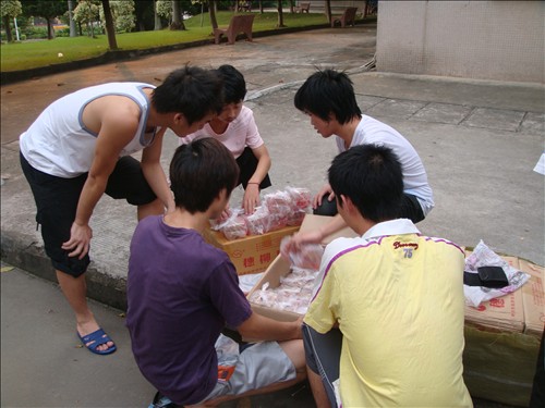 同学们高兴地分发从学院寄来的中秋月饼