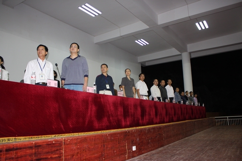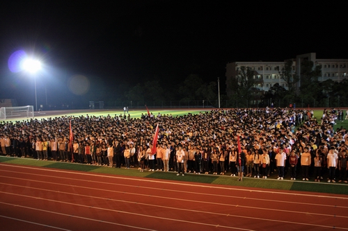 晚上8时整,全体2010级新生在运动场集合完毕,出席领导在主席台就座。