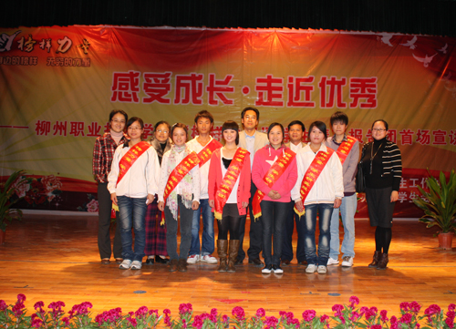 在报告团宣讲会活动中,国家励志奖学金获得者代表经济管理系李成群、区三好学生获得者代表机电工程系韦国辉、艺术设计系谭怡清,柳州市三好学生获得者代表电子电气工程系卓雨柔、院“学习模范”榜样获得者经济管理系胡春婷、“多才多艺”榜样获得者2009级音乐表演班代表陈冰清、“运动精英”榜样获得者经济管理系俞晗祺七位宣讲团成员分别围绕着“榜样传递、感受成长”的主题,讲述了他们在大学求学路上的不畏艰难、坚强乐观的感人故事和当代青年勇于挑战自我、心怀感恩的心路历程。