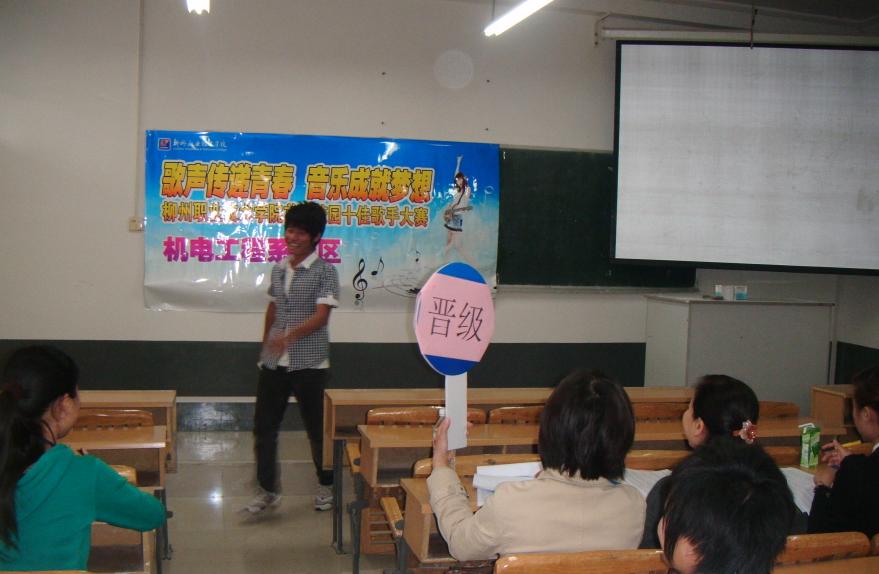 为了丰富校园文化生活,把音乐艺术播撒到全院每一个大学生心中,提升同学们的音乐艺术审美情趣,展现柳职院大学生积极向上的精神风貌。2010年11月5日,由院团委主办的学院第七届“新生节”系列活动之首届十佳歌手大赛在我院社湾、荣军两个校区开展,来自音乐系的数位专业教师及各系分团委书记担任了此次海选大赛的评委。