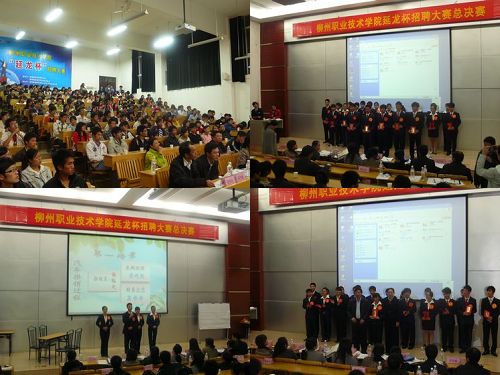 2010年12月2日晚,以“才华与实力融合,延龙祝您前行”为主题的延龙杯2010柳州职业技术学院招聘大赛在学院博闻楼110教室举行。此次大赛由柳州延龙汽车有限公司、柳州职业技术学院招生就业处主办,大学生KAB创业俱乐部承办。学院副院长张翔、院长助理敬志轩、院团委书记杨琳、经济管理系副主任董绿英、科技开发处李庆原及招生就业处的王凤岐、宋星乐出席此次活动。柳州延龙汽车有限公司董事长兼总经理吕刚担任此次大赛总评委,人力资源部经理莫芳、黄秀英,销售部部长王春丽、副部长刘冬红及广西中烟柳州卷烟分厂人力资源科科长石竹胜,柳州壶西小学书记许光,阳和经济开发区顾海萍及我院人事处处长黎凤环担任此次大赛评委。大赛由许明老师主持。