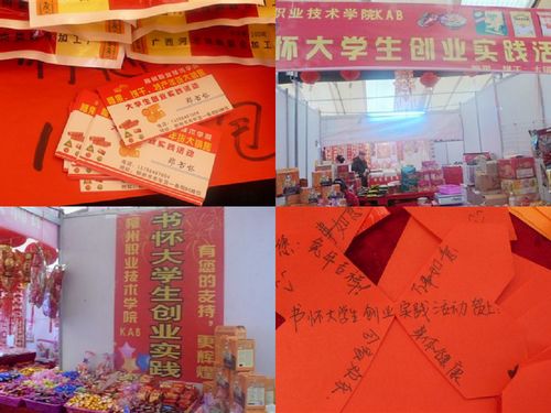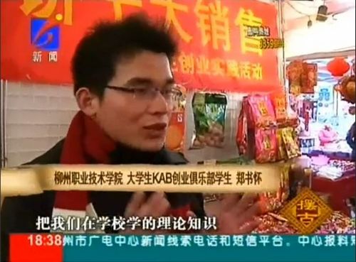 2011年1月15日——1月31日,柳州书市的年货一条街上一个挂着:“书怀大学生创业实践活动”的摊位引起了人们的注意。一个年轻的身影忙里忙外,招呼着客人,派发着自己设计的名片,俨然一副小老板的摸样。他就是我院大学生KAB创业俱乐部的会长郑书怀。为了能够把在学校学习到的创业理论知识运用到实践当中来,他利用寒假实施了自己的创业项目——年货销售!柳州电视台2011年1月25日的《摆古》也对此进行了报道。