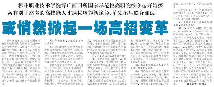 柳州职业技术学院等广西四所国家示范性高职院校今起开始探索有别于高考的高技能人才选拔培养新途径:单独招生联合测试 或悄然掀起一场高招变革