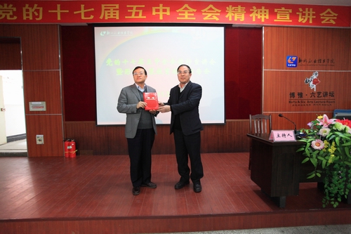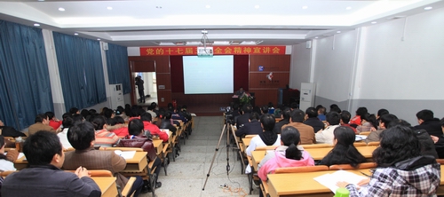 2011年3月25日下午,我院召开党的十七届五中全会精神宣讲会,会议邀请了中共柳州市委副书记、市委党校校长苏海棠作题为《加快柳州工业化城镇化步伐》的报告,我院党委书记朱伟才主持宣讲会。党委副书记阳旭,副院长杨毅、张翔、林若森,院长助理李彰汉、敬志轩,全体中层干部、科级干部、后备干部、教学团队负责人参加宣讲会。