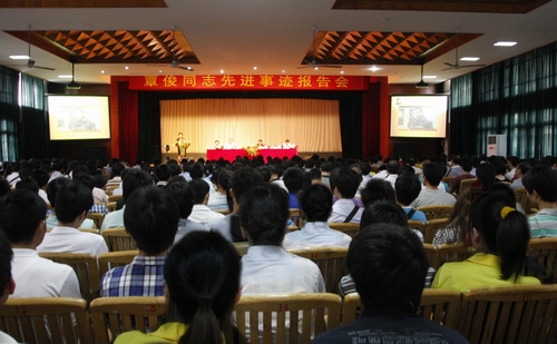 2011年4月28日下午,由柳州市纪委、市委宣传部组织的覃俊同志先进事迹报告会在我院艺术校区礼堂隆重举行。报告会现场座无虚席,学院党委书记朱伟才、院长石令明、党委副书记阳旭、副院长熊文华、副院长张翔,全体中层干部、科级干部、后备干部及各系师生代表共500余人倾听了报告。报告会分别由学院党委副书记、纪委书记阳旭和柳州电视台主持人覃莹莹主持。