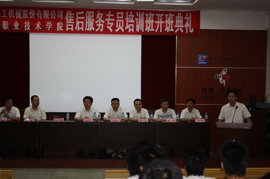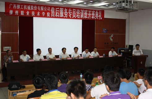2011年6月25日上午,第八期“柳工—柳职院海外售后服务培训班”开班典礼在柳州职业技术学院德馨楼101报告厅举行。来自我院汽车与环境工程系、机电工程系的46名大二学生作为本届培训班学员参加了典礼。广西柳工机械股份有限公司总裁助理罗国兵、国际营销事业部副总经理覃勇、国际营销事业部技术服务总监向冬生、国内营销事业部技术服务中心总监柳耀萍、国际营销事业部人事经理尹亮、国内营销事业部培训中心叶文豪、国际营销事业部行政人事部李匀,我院党委副书记阳旭,汽车与环境工程系、机电工程系党总支书记出席会议??嗟淅裼杉绦逃行闹魅卫韪罩鞒?。