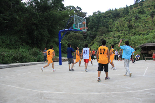 与村民进行篮球比赛
