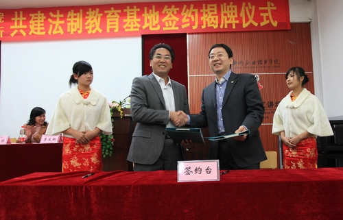 仪式上,学院阳旭副书记与广西信和律师事务所崔宇平主任代表双方单位签订了《共建法制教育基地协议书》,协议对双方共建目标、共建内容等方面作了明确规定。