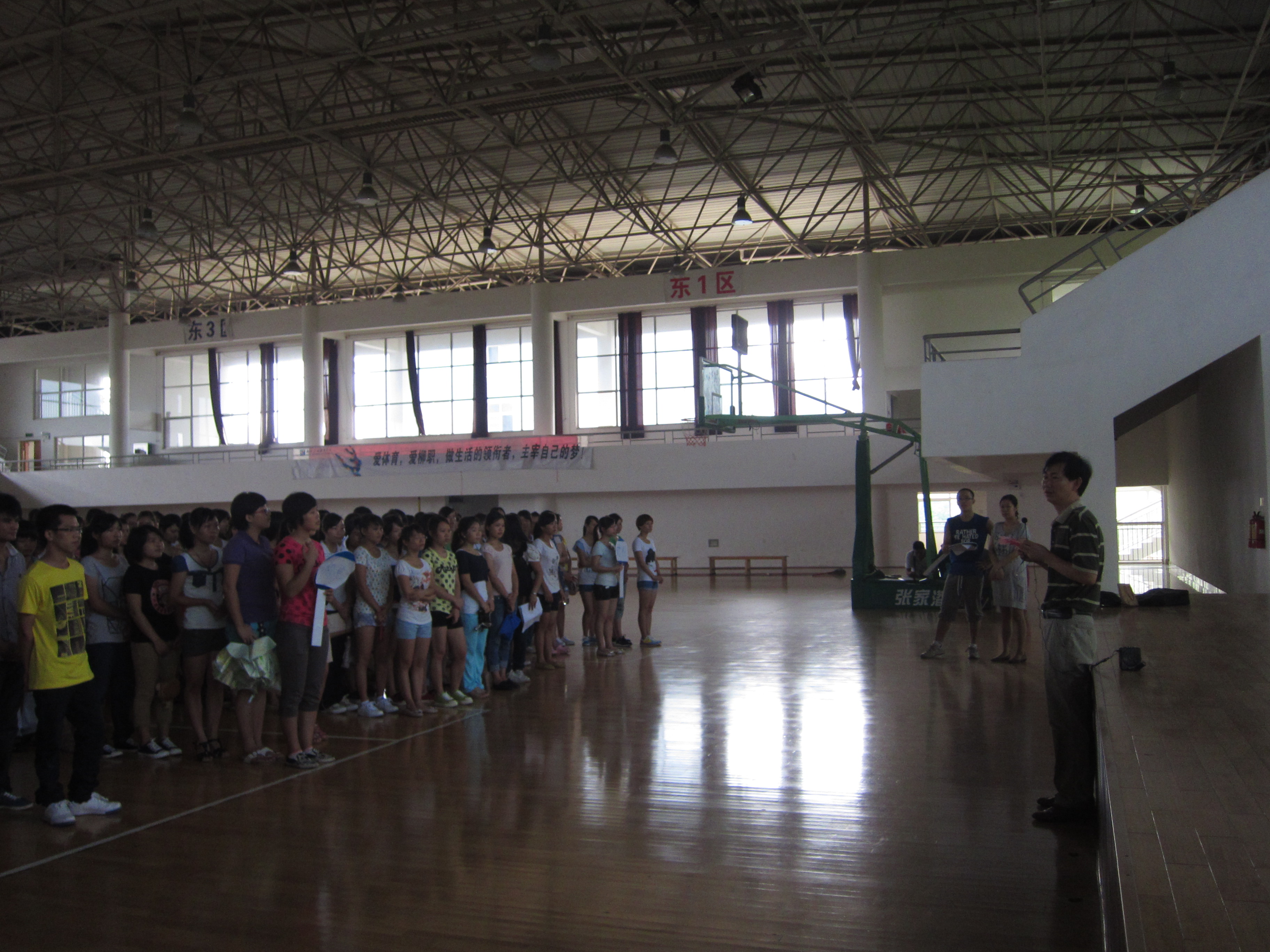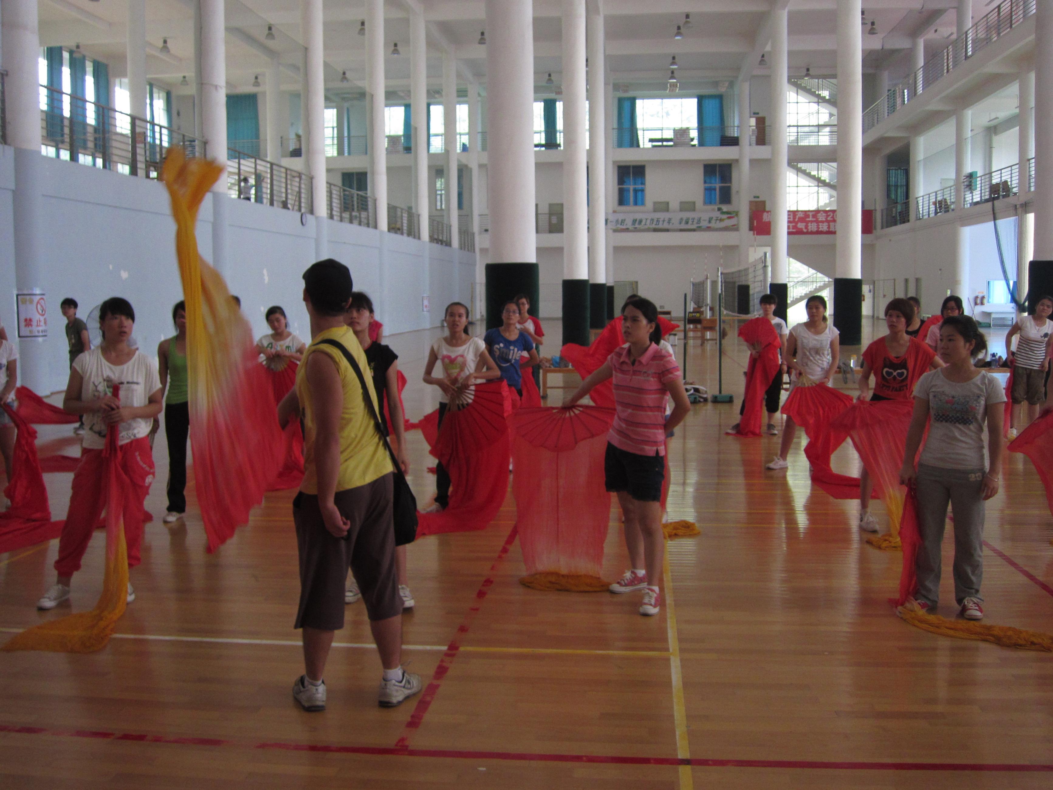 8月里的每一天似乎都特别枯燥漫长,但却又似乎特别令人感动。自8月10日起的训练阶段里,校体育馆各楼层里时刻都可以看到那一簇簇活跃的鲜艳色彩,那就是运动会志愿者排练的身影。近400人的队伍被分成了5支小组,他们每天几乎都是从早到晚的在闷热的场馆里训练,累了就在体育馆的地板上躺一下,每一位志愿者都在默默坚持着,面对高难度的训练任务、身体上的不舒适等他们都在努力学着调适。在后期的训练任务中,不少同学由于长时间抓握厚重道具导致手掌起水泡,磨破手掌的女孩子们却笑着把创口贴换上就跑回训练场了。担任小组负责人的10名同学是来自院级各学生团体的骨干份子,因为进程安排,很多节目排练还要在晚上进行,这些同学连续几天都是从早上8点直到晚上10点才能回到宿舍休息,他们既要负责节目的跟踪排练,还要负责音响设备的操作与搬运、志愿者的每日考勤,除此之外的人员交通运输、药品、食品、饮用水的统计筹备他们也要配合团委老师统计分发。20多天的训练她们一天都不曾休息,训练任务重,时间长,由160位女生组成的一支队伍在开幕式中担任着2个节目的演出,而她们每天都是起来的最早,走的最晚的一个队伍。