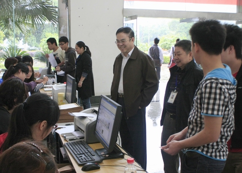 2012年4月21日下午,柳州职业技术学院、广西机电职业技术学院、广西职业技术学院、广西水利电力职业技术学院四所高职院校单独(对口)招生联合测试顺利开考,5200多名考生分别在南宁、柳州两地考点参加了单独(对口)联合测试,确认当天共有2000多考生到柳职院设置的考点确认信息和参加考试。学院领导朱伟才书记、石令明院长、张翔副院长、敬志轩院长助理到场巡视了现场确认及考试情况。