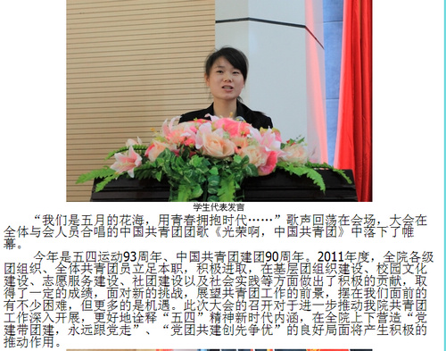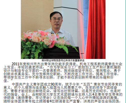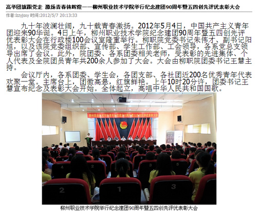2012年5月10日,柳州教育局网站发布我院举行庆祝中国共青团成立90周年暨五四创先评优表彰大会的信息。(崔智慧)