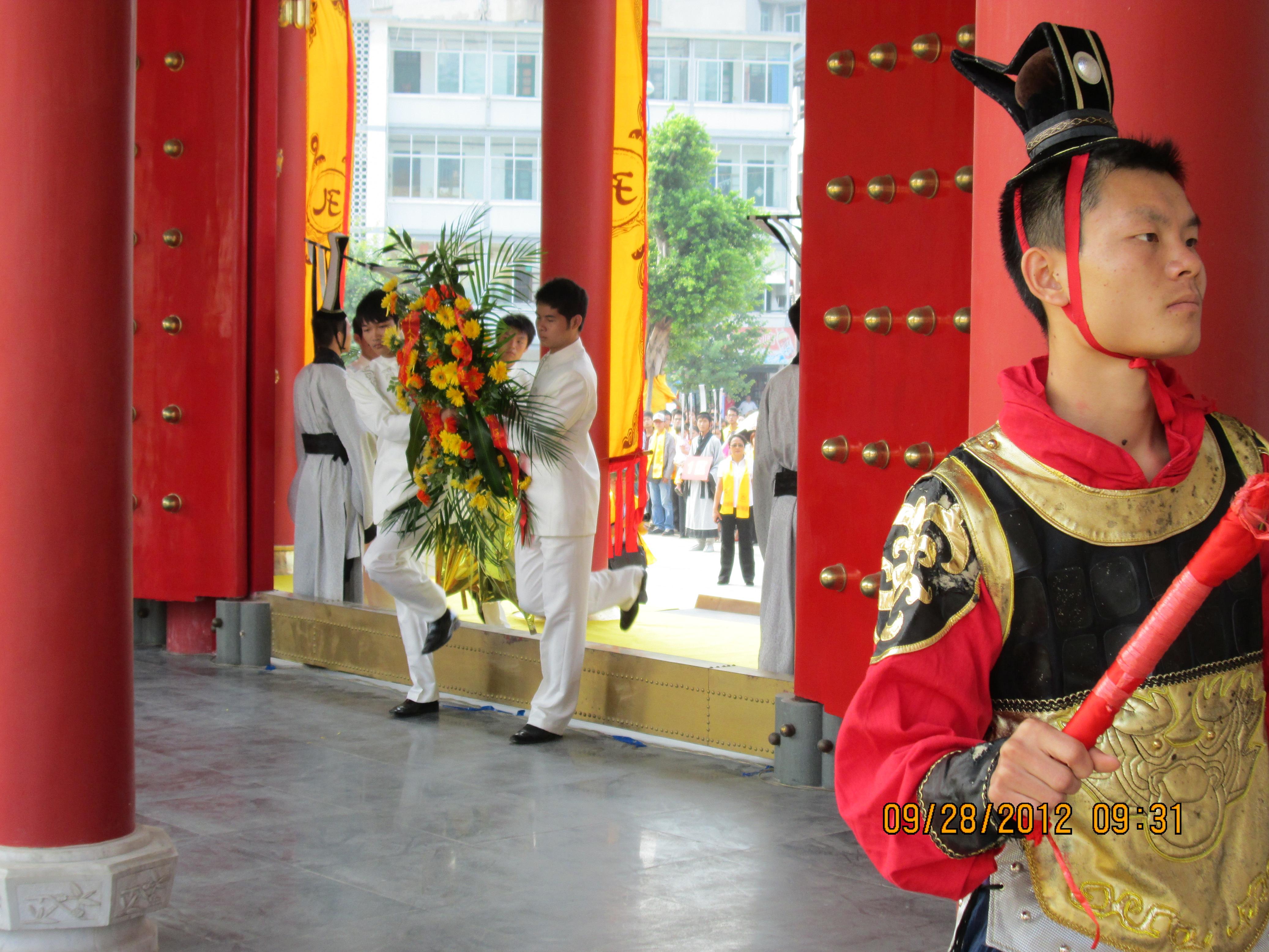 “启——户——”击鼓鸣钟,大成门开,花篮礼仪入场