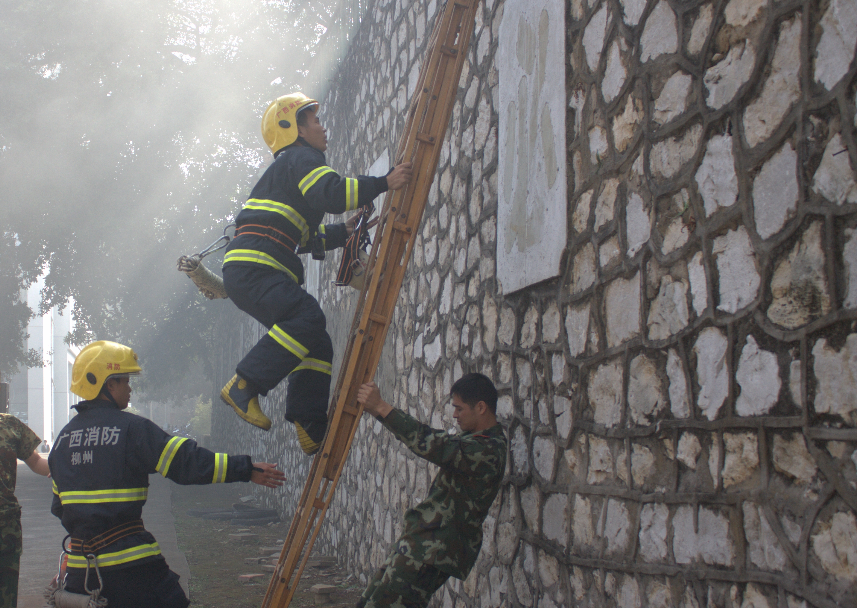 消防队员在演练救人