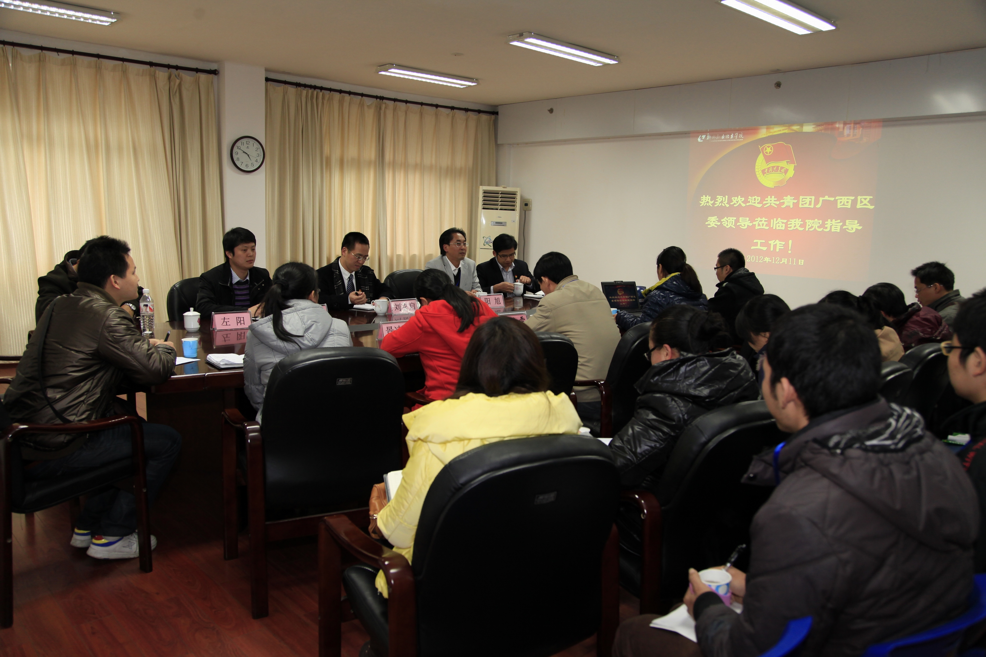 12月11日下午,共青团广西区委副书记刘玄启、共青团柳州市委副书记张闰、共青团广西区委学校部、团市委学校部等领导一行4人莅临我院调研共青团工作。调研会议在行政楼303室召开,会议由我院党委副书记阳旭主持,我院学生工作处副处长唐冬雷(主持工作)、团委书记王慧、学生工作处、团委的老师、各系分团委书记、各级学生会、院社团联学生骨干代表等出席了会议。