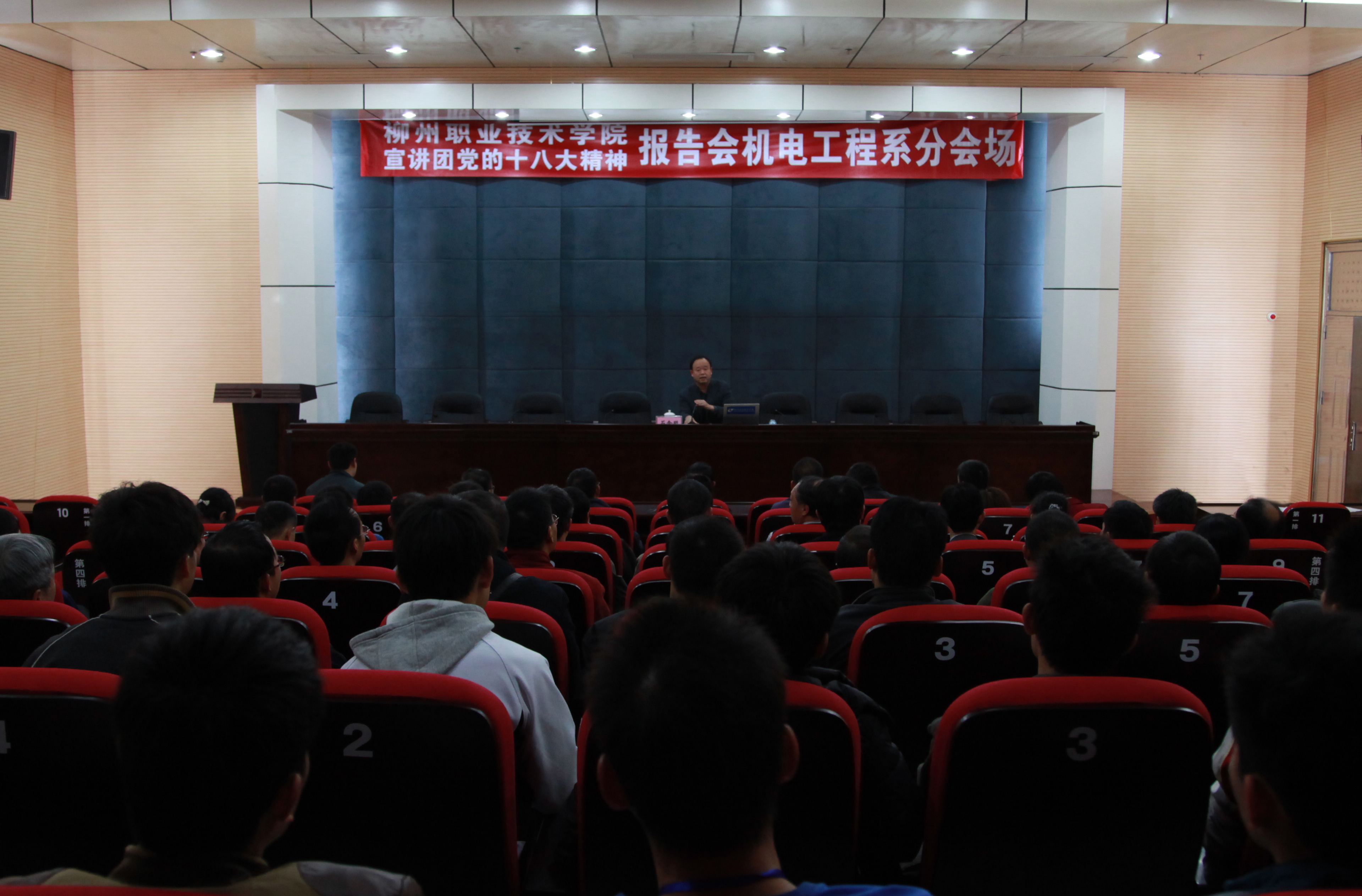 12月14日下午,柳州职业技术学院100报告厅内座无虚席,机电工程系师生学习宣传贯彻党的十八大精神宣讲会在这里举行。学院院长石令明为机电工程系近两百名师生作了一场精彩的十八大精神宣讲报告。生动的讲述获得师生阵阵热烈的掌声。
