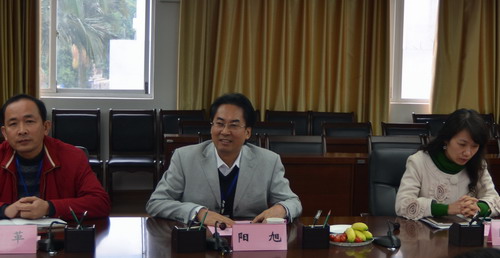 学院党委副书记阳旭(中)欢迎客人们来访