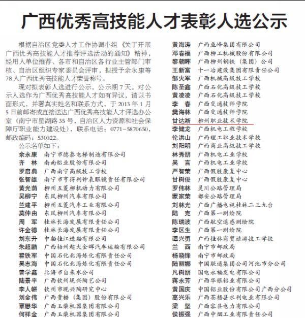新闻网消息:(记者崔智慧 图崔智慧)2012年12月29号,自治区党委人才工作协调小组办公室在广西日报上公示了广西优秀高技能人才表彰人选名单,我院机电工程系教师甘达淅名列其中。