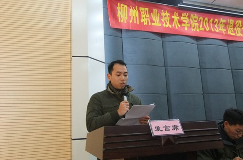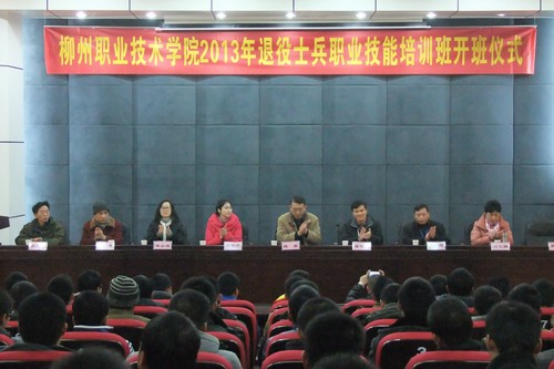 2013年1月11日上午,我院举行了2013年退役士兵职业技能培训开班仪式,柳州市民政局副局长蒋智勇、柳州市安置办副主任刘华萍、学院副院长杨毅、继续教育中心主任黎刚、系部分管领导、班主任、学员代表出席了开班仪式。仪式由黎刚主任主持。