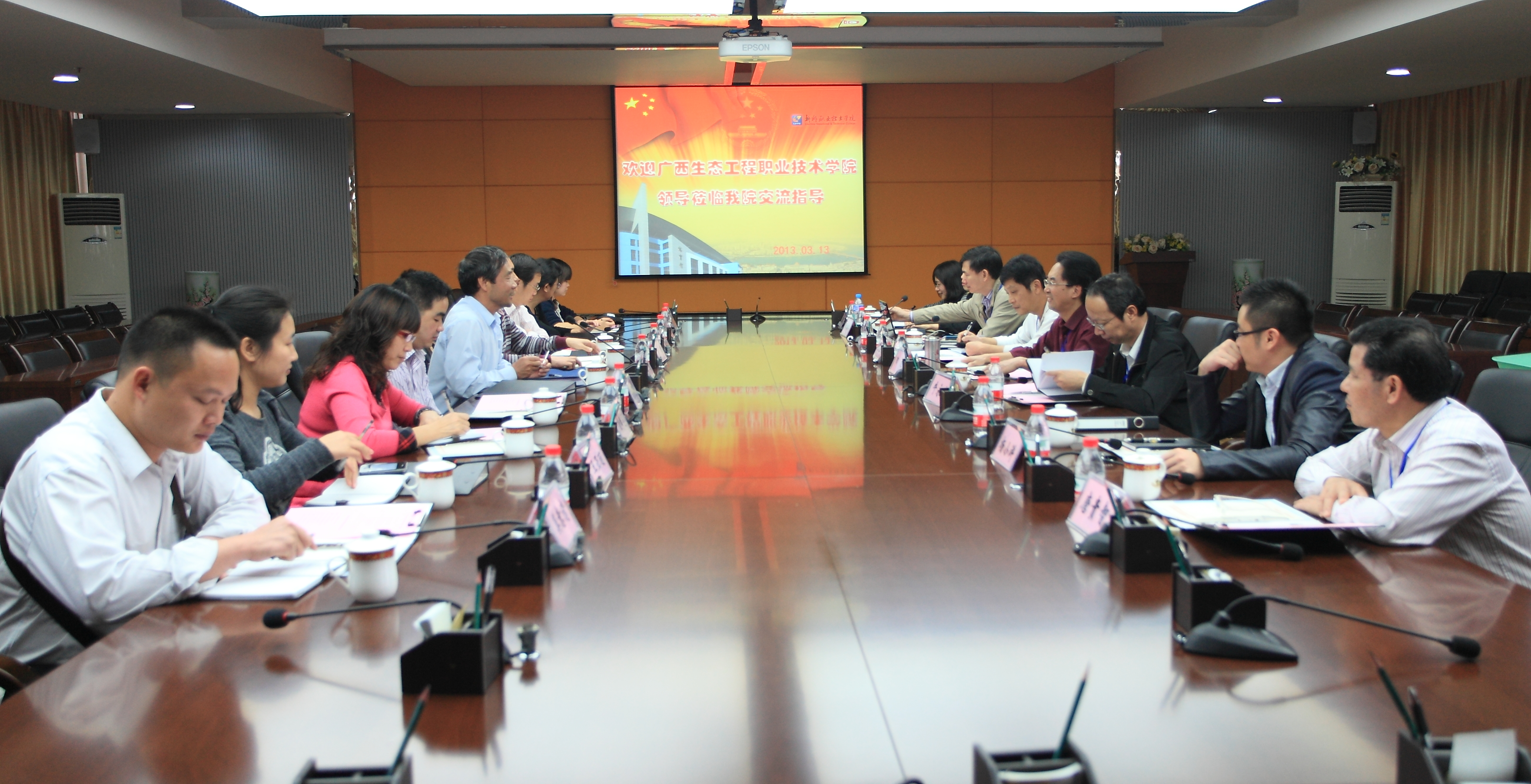 2013年3月13日下午,广西生态工程职业技术学院党委副书记黄健一行9人来我院考察交流,我院党委副书记阳旭、学生工作处处长唐冬雷等热情接待了来访客人。