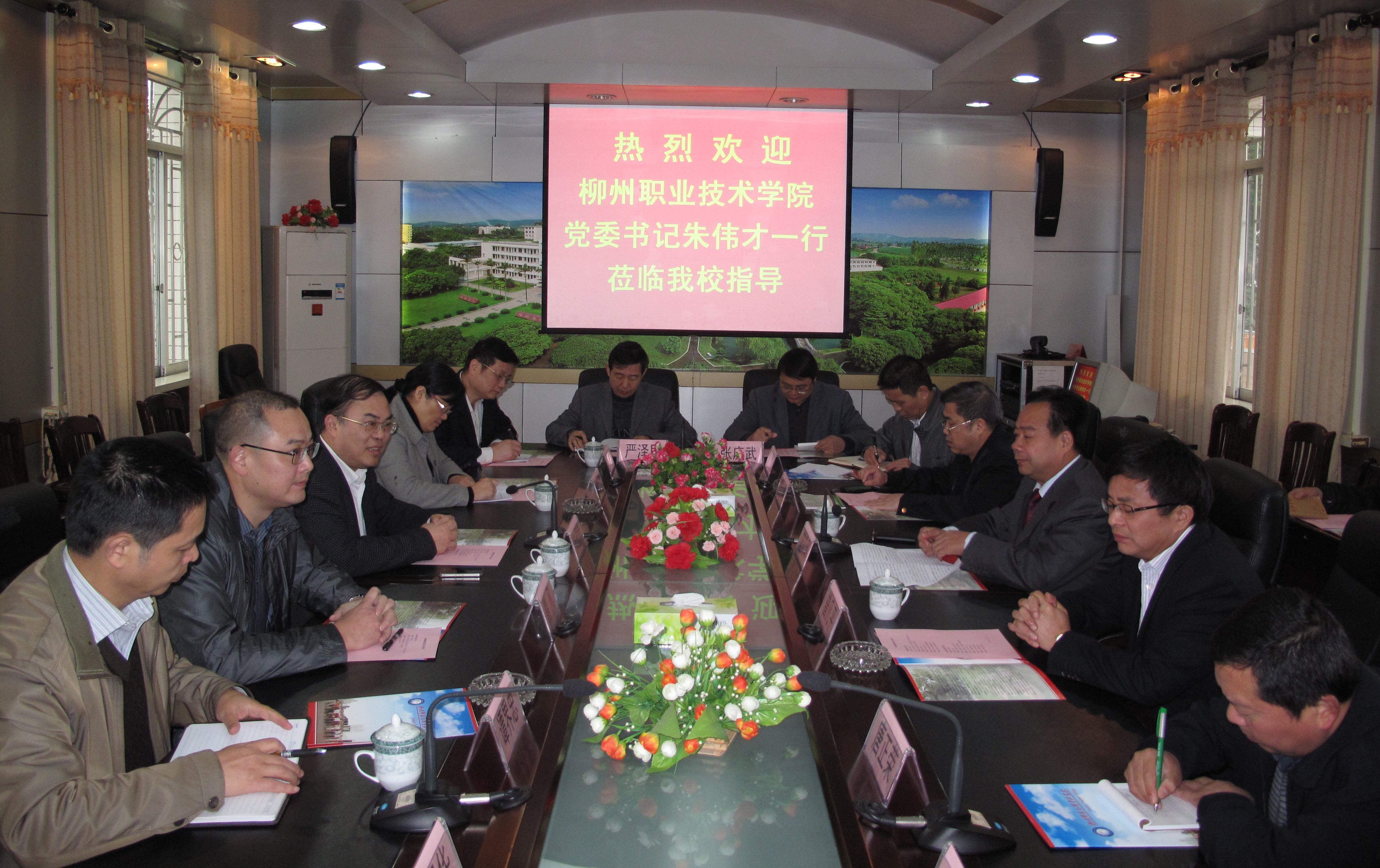 2013年4月11日,学院党委书记朱伟才带领党委办公室、党委组织部、党委宣传部、教务与实训管理处、后勤与资产管理处、科技开发处、财务处等部门的负责同志一行8人到柳州师范高等专科学校(以下简称柳州师专)就推进学校建设发展和开展党建活动专题进行了考察调研。柳州师专蓝凡华书记、曾凡平校长及相关部门负责同志热情地接待了学院考察调研组。