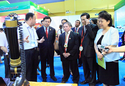 自治区副主席李康(右一)陪同国家教育部副部长杜占元(左二),柬埔寨王国教育青年体育部部长尹赛迪(左三),泰王国教育部部长差图龙?蔡桑(右二)等国内外官员参观了我院展位,石令明院长详细介绍我院数字化设计与制造设备情况。