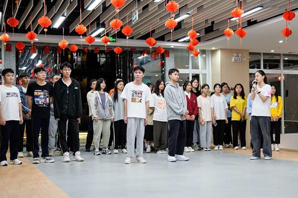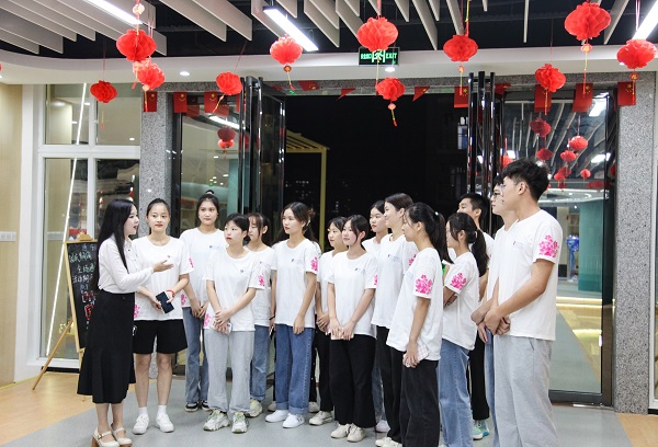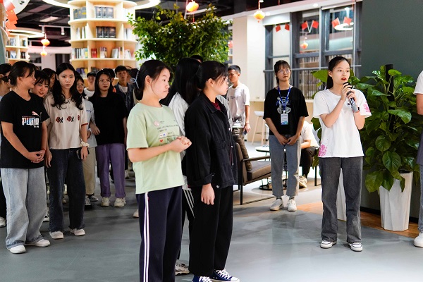 学生导览员们在活动前认真聆听匠心书院老师指导讲解书院