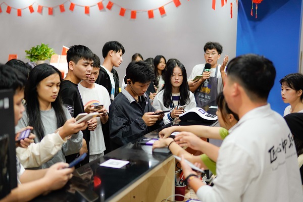 学子们在前台领取新语心愿卡与匠心探索笔记