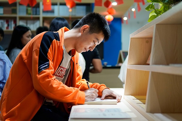 目前,活动持续火爆进行中,前来参观的同学都沉浸其中,认真听讲解,跟随导览员参观了解匠心书院各区域不同功能和特色、了解书院的书籍以及开展的活动等。导览员们还为前来参观的同学推荐书院各处高颜值打卡点,预告匠心书院将持续推出的精彩活动,激起了同学们对匠心书院的极大兴趣。本次活动还为前来参观的同学们精心准备了匠心书院定制的“新语心愿卡”与匠心探索笔记本。导览探院环节结束,同学们在书院前台领取心愿卡,写下自己美好的大学心愿并交给书院,由书院为同学们珍藏,待同学们毕业后来再来领取。书院还为同学们准备了独家设计的匠心探索笔记本和书院首枚打卡印章,同学们纷纷表示探院体验十分愉快,印象深刻。