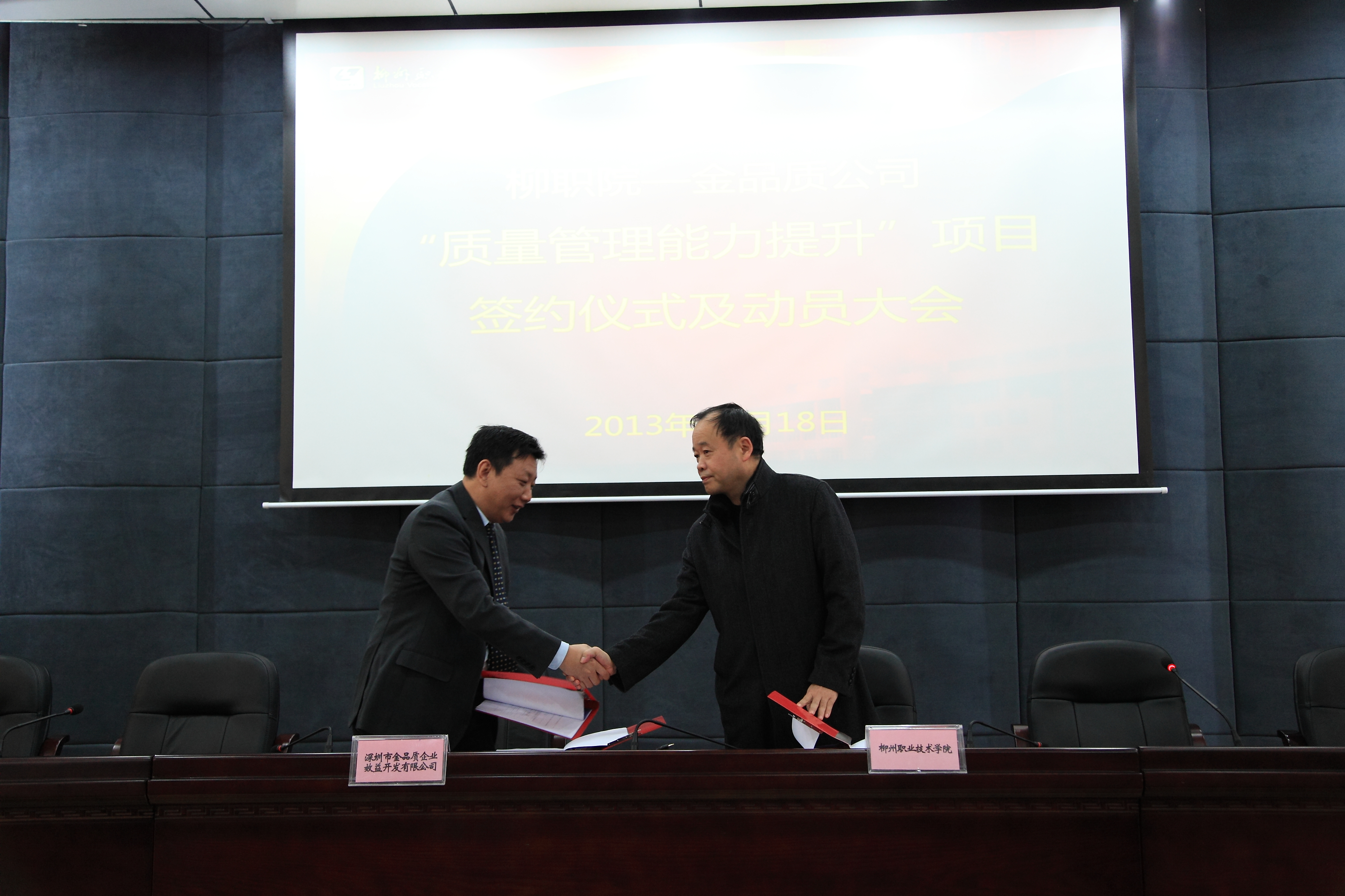2013年12月18日下午,我院在100会议室与深圳金品质企业效益开发有限公司举行了“质量管理能力提升”项目的签约仪式,并召开了全院启动动员大会。学院领导、签约公司总经理才激扬率领的顾问团队、学院质量管理工作各级领导小组全体成员、科级以上干部及各部门教职工代表近150人参会。大会由林若森副院长主持。