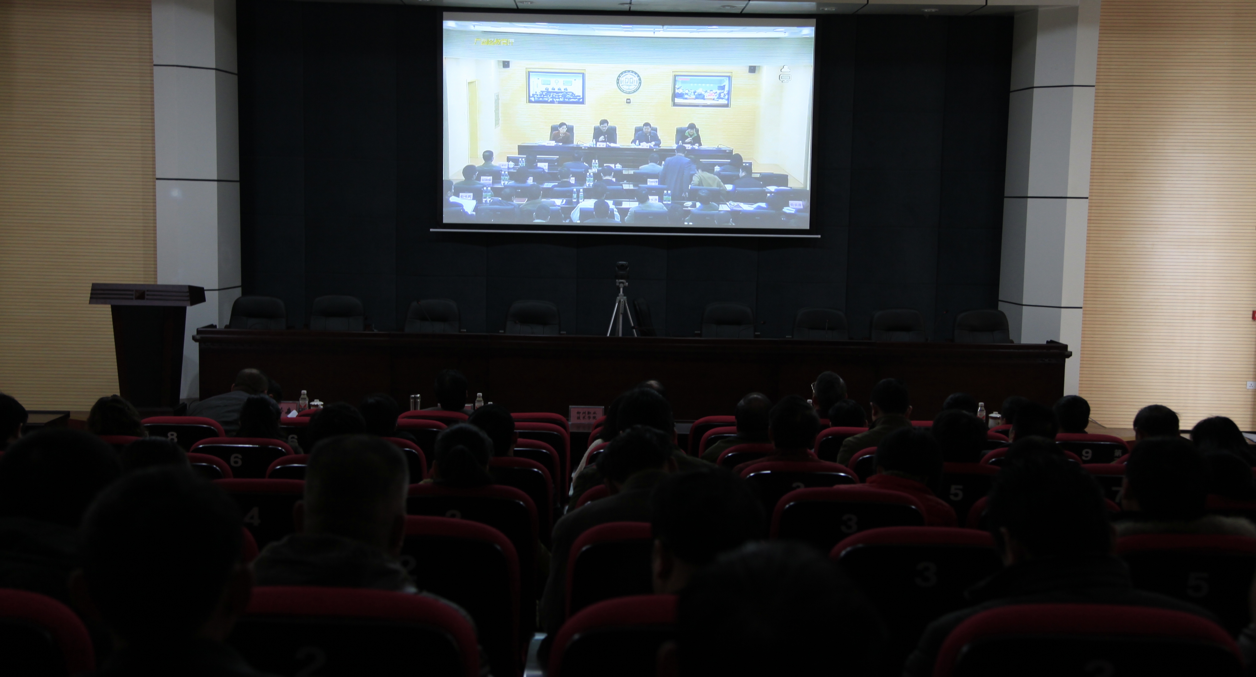 自治区教育厅于2014年3月10日下午召开教育系统党风廉政建设工作暨全区治理教育乱收费厅际联席会视频会议,根据教育厅《关于召开2014年全区教育系统党风廉政建设工作暨全区治理教育乱收费厅际联席会视频会议的通知》(桂党高工办〔2014〕14号)要求,我院设分会场,学院全体院领导、院长助理、各部门中层正职、学院纪委委员在行政楼100报告厅参加了视频会议。