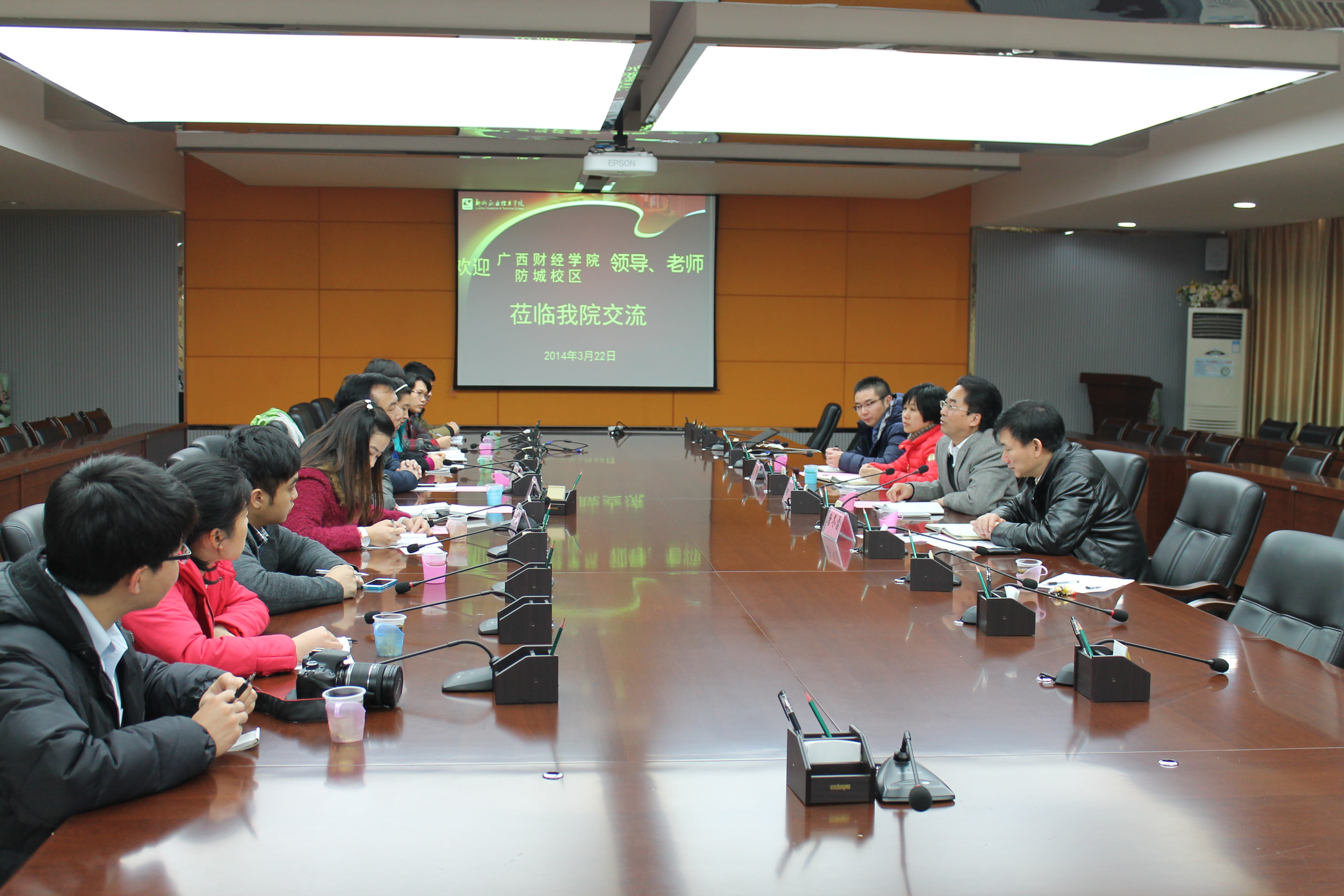 2014年3月22日下午,广西财经学院防城校区党总支书记严民富一行11人来我院考察交流,我院党委副书记阳旭及学生工作处、院团委负责人及相关人员热情接待了来访客人。