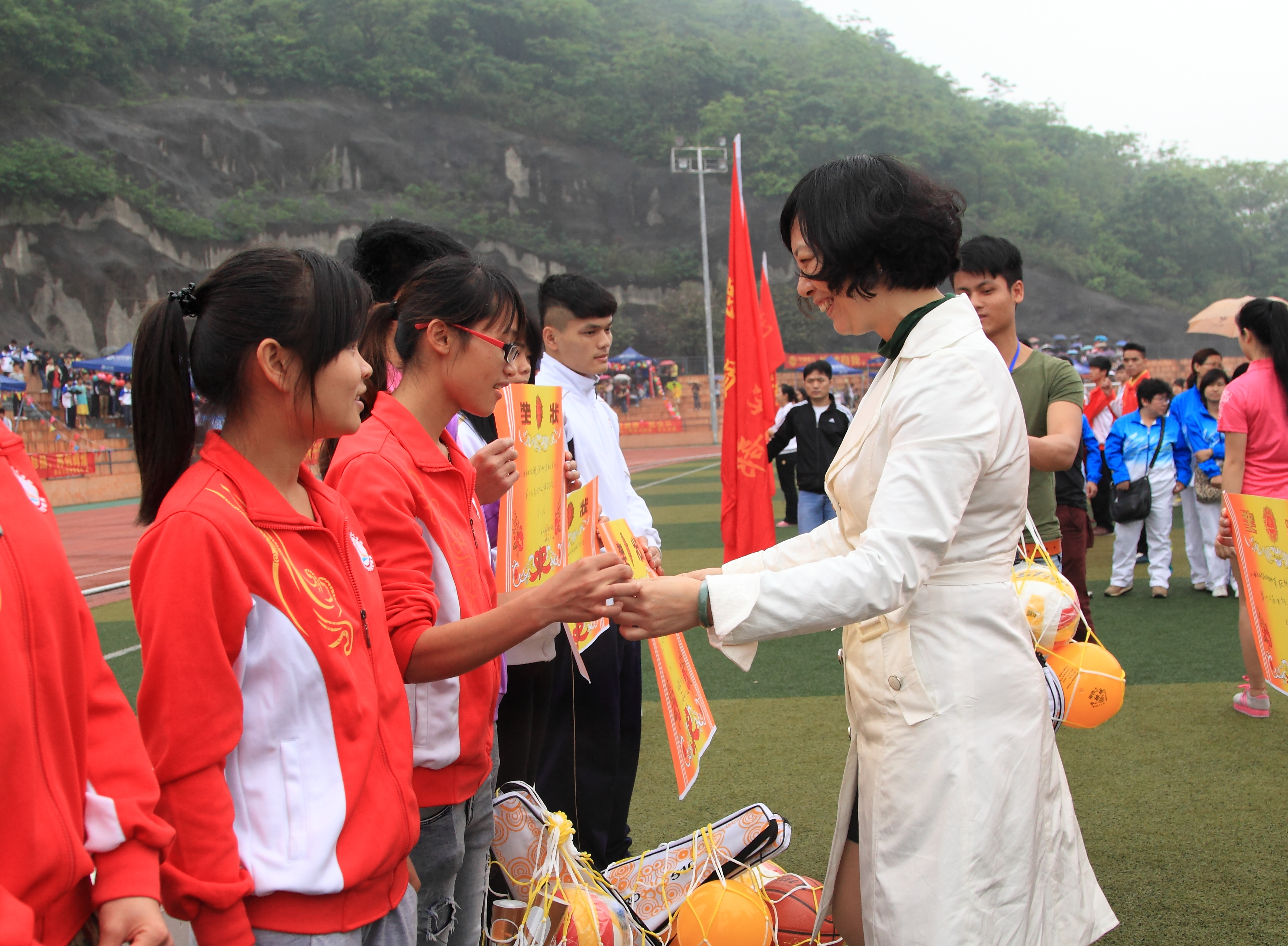 上午十一时,学院第十六届田径运动会闭幕式准时开始,学院领导及运动会组委会成员在主席台就座,各系部运动员在田径场上整齐列队,等待荣誉加身的光荣一刻??皇接裳г焊痹撼姆仓鞒郑硕嶙懿门谐?、公共基础部副主任李革宣读成绩及获奖名单。党委书记朱伟才、院长石令明、党委副书记阳旭、副院长鞠红霞在振奋的音乐声中走向颁奖台为获奖单位及个人颁奖。