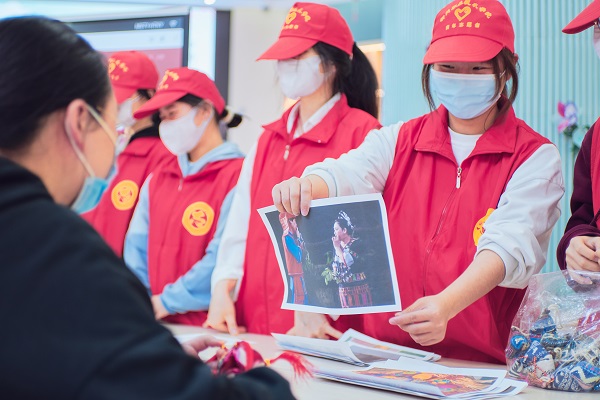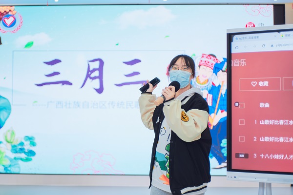 校青年志愿者服务总队的志愿者讲解“三月三”民俗文化