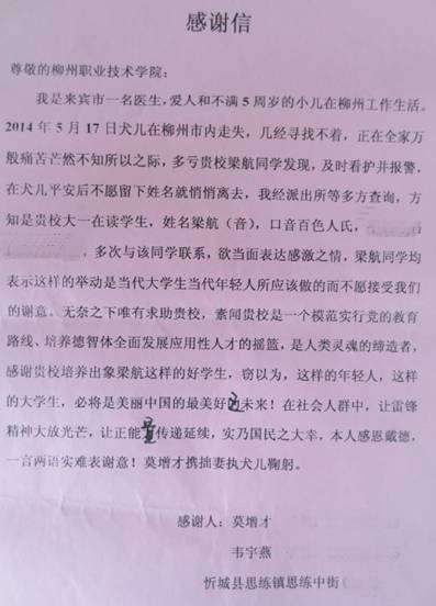 2014年5月19日上午,来宾市忻城县思恋镇思恋中街莫增才、韦宇燕夫妇把一封粉红的感谢信送到柳州职业技术学院学工处,感谢该校汽车工程系2013级汽车技术服务与营销3班梁航、劳大钦、蒙江婷、黄彩玲等四位同学帮他们找回走失的儿子。