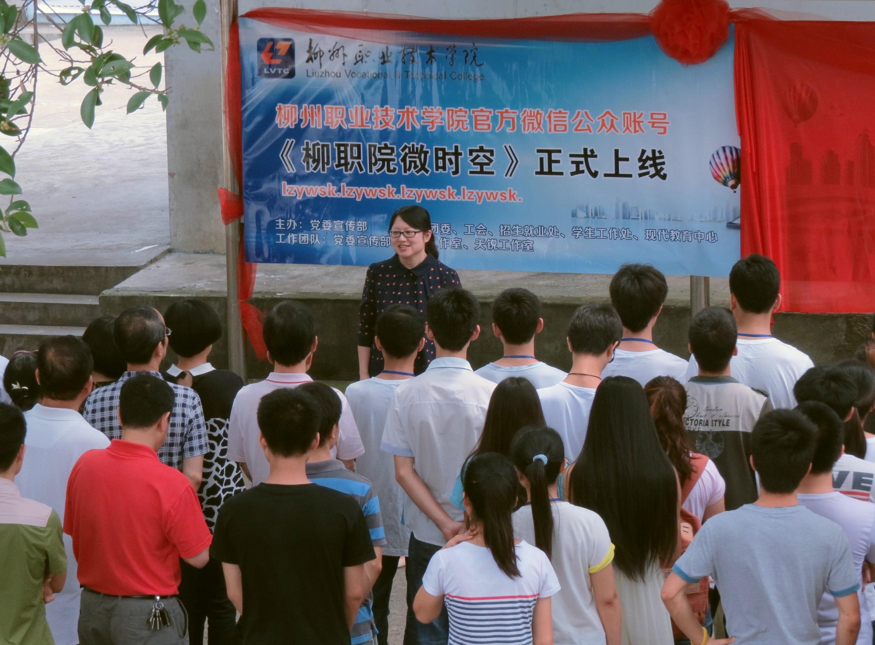 在院领导的支持下,在团委、招生就业处、工会的鼎力配合下,党委宣传部带领天锐工作室的同学们紧张筹备了快一个学期,学院微信公众账号《柳职院微时空》终于横空出世了!5月30日中午11:30,《柳职院微时空》微信账号揭幕仪式在A区食堂门前如期举行。选择在中午人流量较大的食堂楼前揭幕正是与《柳职院微时空》接地气、关注学生及老师生活点滴的风格不谋而合。