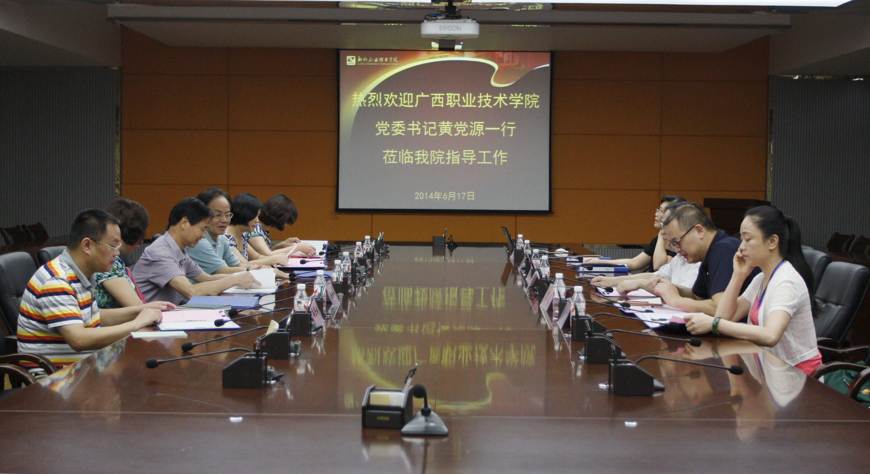 6月17日上午,广西职业技术学院党委书记黄党源、副院长黄云峰、程云燕等一行6人到我院交流,学院党委书记朱伟才、副院长林若森陪同参观了我院机电实训基地,之后在300会议室进行了座谈交流,学院副院长瞿凡、人事处处长黎凤环、招生就业处处长黄莉、教务与实训管理处副处长黎华参加了座谈会。